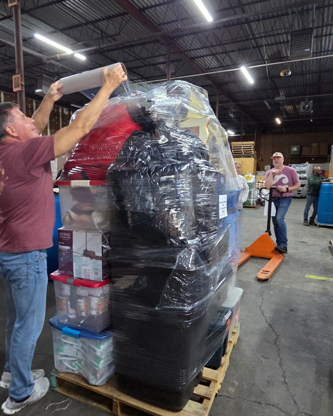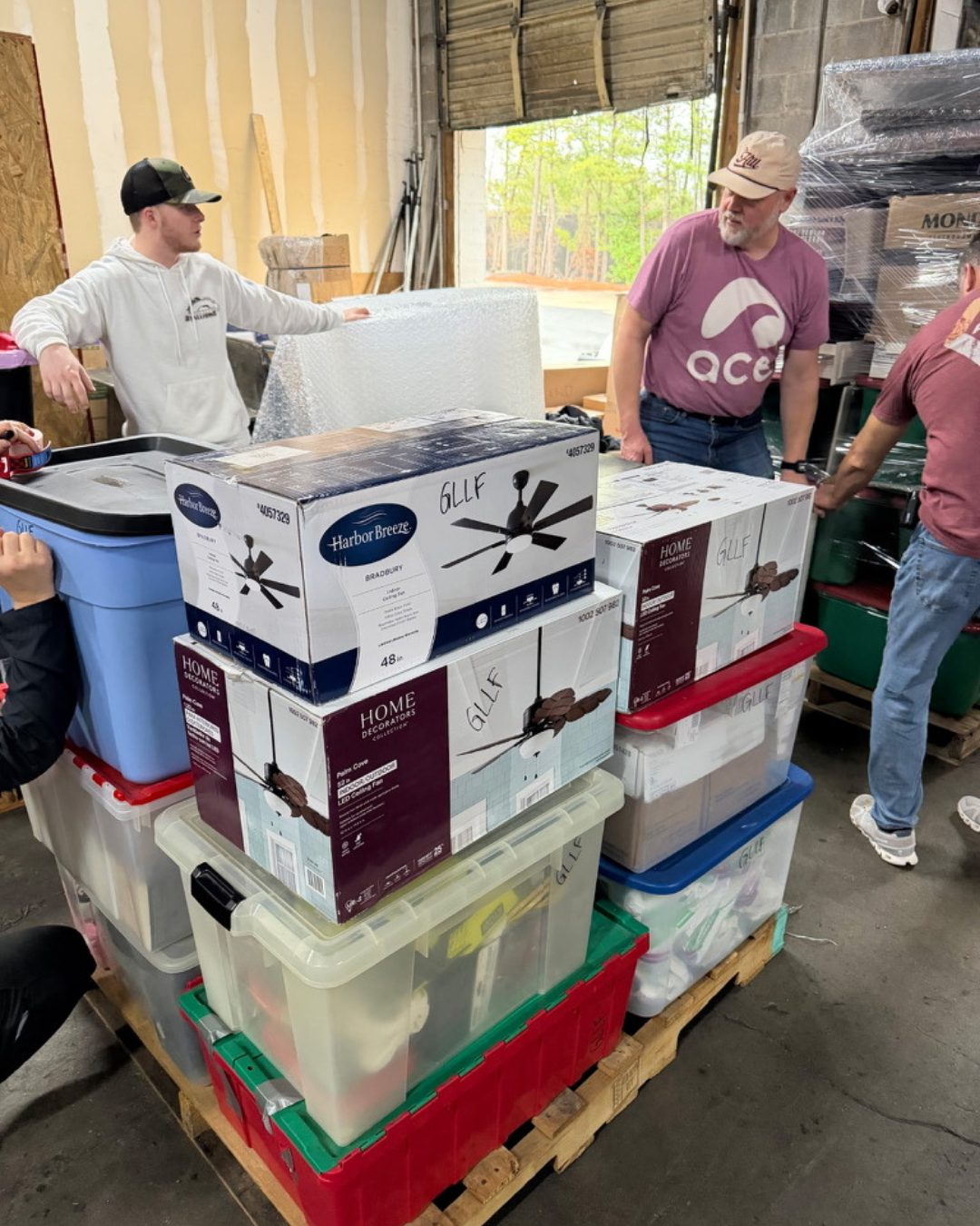 As we say at ACE, leadership starts at the top. Our Chairpersons, Dixon and Georgianna, were right there grunting and wrapping all the donations onto pallets and sealing everything with plastic. Allen, of course, was the main man behind the scenes, calculating every pallet like a puzzle and making sure they all fit together.